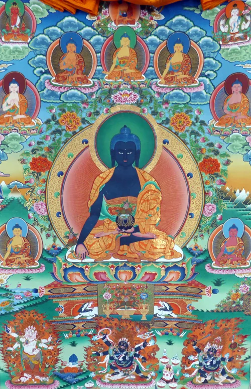 Medicine Buddha Puja, The Wish-Fulfilling Jewel, er en mere omfattende praksis. Denne praksis er ekstremt kraftfuld og velgørende. De Otte Medicin Buddhaer foretog særlige bønner om, at deres evne til at hjælpe andre ville tiltage i netop denne tidsalder med så mange krige, uhelbredelige sygdomme og katastrofer. Gennem denne praksis foretager vi omfattende ofringer til ære for de Otte Medicin Buddhaer og genkalder os de særlige bønner, som disse foretog på deres vej hen mod oplysning. Ved at gøre dette aktiverer vi disse oplyste væseners stærke healende energi, og vi leder dem til at gavne både os selv og andre.